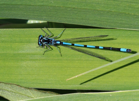 One of several similar blue damselflies found in the UK, this slender insect has a patchy distribution across mainland Britain, but is very common in Ireland. Azure damselflies are most often found among plants on the banks of well-vegetated ditches, canals and ponds. They are rarely found by flowing water.